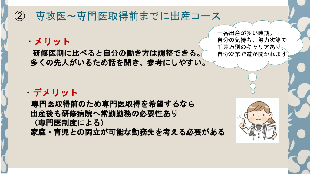 #7. ② 専攻医~専門医取得前までに出産コース ・メリット 研修医期に比べると自分の働き方は調整できる。 多くの先人がいるため話を聞き、参考にしやすい。 一番出産が多い時期。 自分の気持ち、努力次第で 千差万別のキャリアあり。 自分次第で道が開かれます。 ・デメリット 専門医取得前のため専門医取得を希望するなら 出産後も研修病院へ常勤勤務の必要性あり (専門医制度による) 家庭・育児との両立が可能な勤務先を考える必要がある