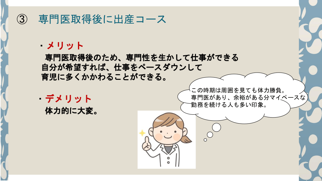#8. ③ 専門医取得後に出産コース ・メリット 専門医取得後のため、専門性を生かして仕事ができる 自分が希望すれば、仕事をペースダウンして 育児に多くかかわることができる。 ・デメリット 体力的に大変。 この時期は周囲を見ても体力勝負。 専門医があり、余裕がある分マイペースな 勤務を続ける人も多い印象。