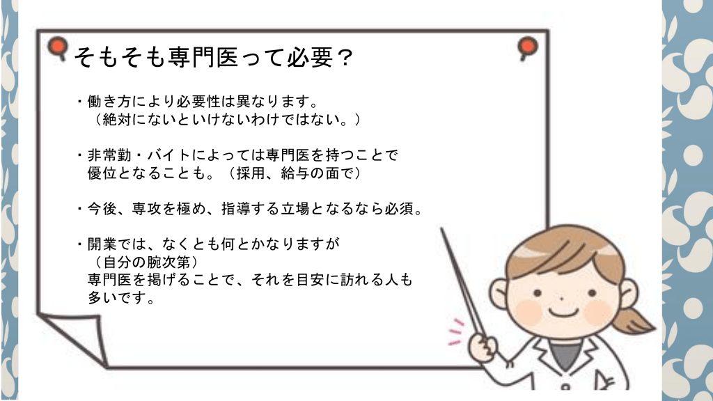 #9. そもそも専門医って必要? ・働き方により必要性は異なります。 (絶対にないといけないわけではない。) ・非常勤・バイトによっては専門医を持つことで 優位となることも。(採用、給与の面で) ・今後、専攻を極め、指導する立場となるなら必須。 ・開業では、なくとも何とかなりますが (自分の腕次第) 専門医を掲げることで、それを目安に訪れる人も 多いです。