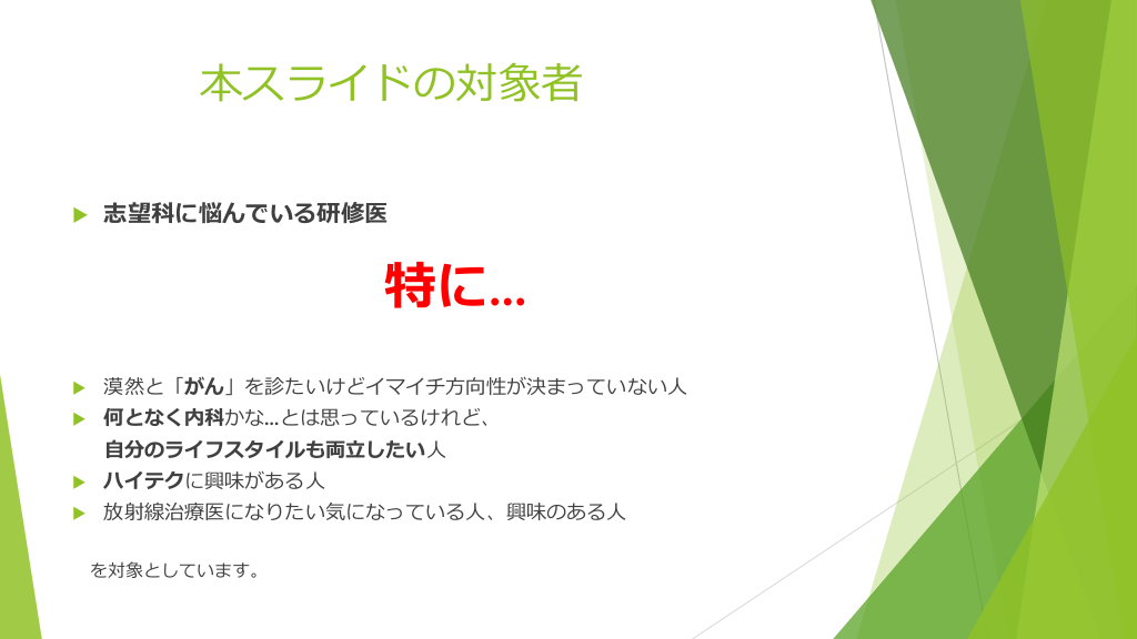 放射線治療医の魅力、ご存じですか?志望科に悩んでいる研修医、特に『漠然と「がん」を診たいけどイマイチ方向性が決まっていない人』『何となく内科かな…とは思っているけれど自分のライフスタイルも両立したい人』『ハイテクに興味がある人』『放射線治療医になりたい気になっている人』『興味のある人』、ぜひご覧ください。