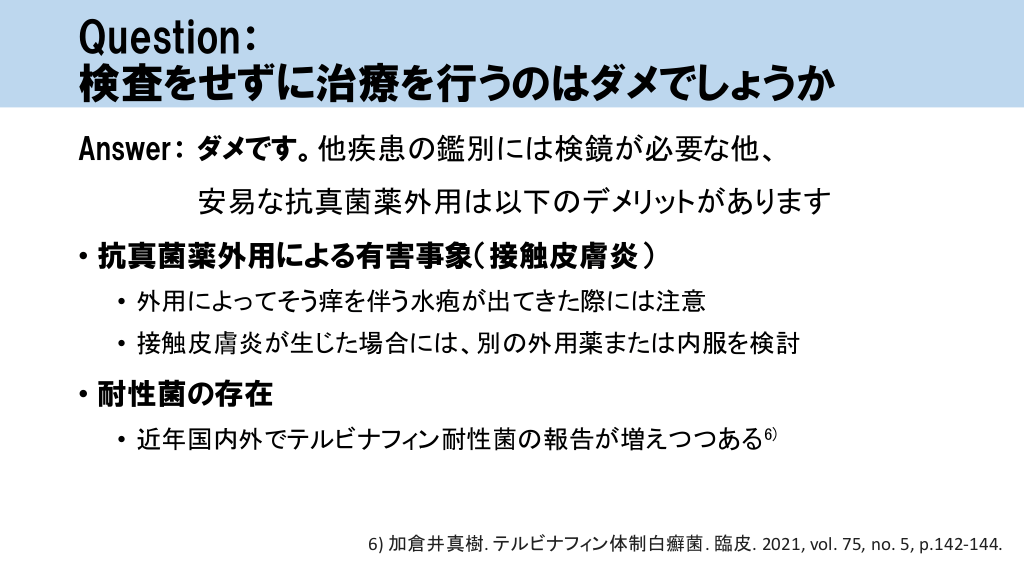 #10. Question: 検査をせずに治療を行うのはダメでしょうか Answer: ダメです。他疾患の鑑別には検鏡が必要な他、 安易な抗真菌薬外用は以下のデメリットがあります • 抗真菌薬外用による有害事象(接触皮膚炎) • 外用によってそう痒を伴う水疱が出てきた際には注意 • 接触皮膚炎が生じた場合には、別の外用薬または内服を検討 • 耐性菌の存在 • 近年国内外でテルビナフィン耐性菌の報告が増えつつある6) 6) 加倉井真樹. テルビナフィン体制白癬菌. 臨皮. 2021, vol. 75, no. 5, p.142-144.