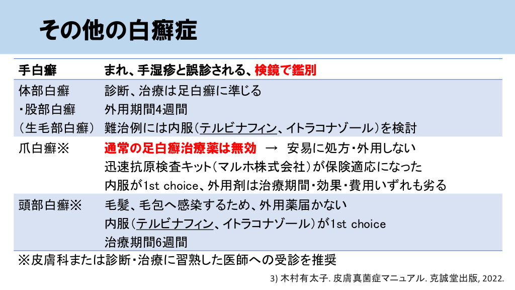 #11. その他の白癬症 手白癬 まれ、手湿疹と誤診される、検鏡で鑑別 体部白癬 診断、治療は足白癬に準じる ・股部白癬 外用期間4週間 (生毛部白癬) 難治例には内服(テルビナフィン、イトラコナゾール)を検討 爪白癬※ 通常の足白癬治療薬は無効 → 安易に処方・外用しない 迅速抗原検査キット(マルホ株式会社)が保険適応になった 内服が1st choice、外用剤は治療期間・効果・費用いずれも劣る 頭部白癬※ 毛髪、毛包へ感染するため、外用薬届かない 内服(テルビナフィン、イトラコナゾール)が1st choice 治療期間6週間 ※皮膚科または診断・治療に習熟した医師への受診を推奨 3) 木村有太子. 皮膚真菌症マニュアル. 克誠堂出版, 2022.