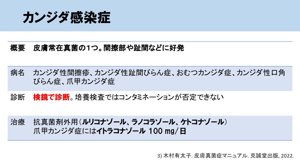 #12. カンジダ感染症 概要 皮膚常在真菌の1つ。間擦部や趾間などに好発 病名 カンジダ性間擦疹、カンジダ性趾間びらん症、おむつカンジダ症、カンジダ性口角 びらん症、爪甲カンジダ症 診断 検鏡で診断。培養検査ではコンタミネーションが否定できない 治療 抗真菌剤外用(ルリコナゾール、ラノコラゾール、ケトコナゾール) 爪甲カンジダ症にはイトラコナゾール 100 mg/日 3) 木村有太子. 皮膚真菌症マニュアル. 克誠堂出版, 2022.