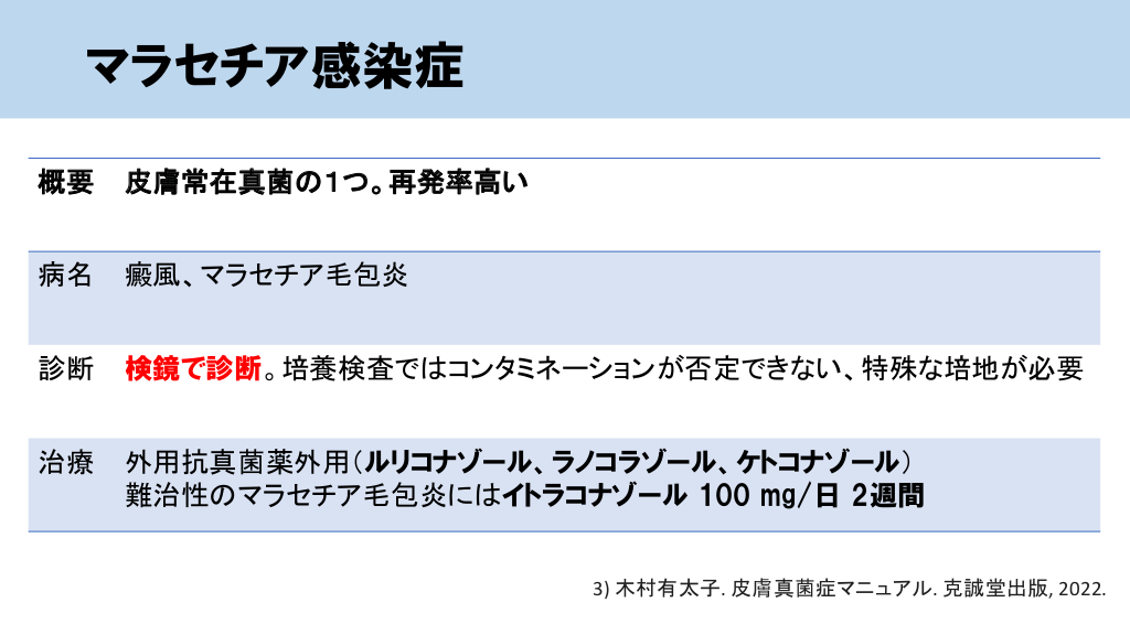 #13. マラセチア感染症 概要 皮膚常在真菌の1つ。再発率高い 病名 癜風、マラセチア毛包炎 診断 検鏡で診断。培養検査ではコンタミネーションが否定できない、特殊な培地が必要 治療 外用抗真菌薬外用(ルリコナゾール、ラノコラゾール、ケトコナゾール) 難治性のマラセチア毛包炎にはイトラコナゾール 100 mg/日 2週間 3) 木村有太子. 皮膚真菌症マニュアル. 克誠堂出版, 2022.