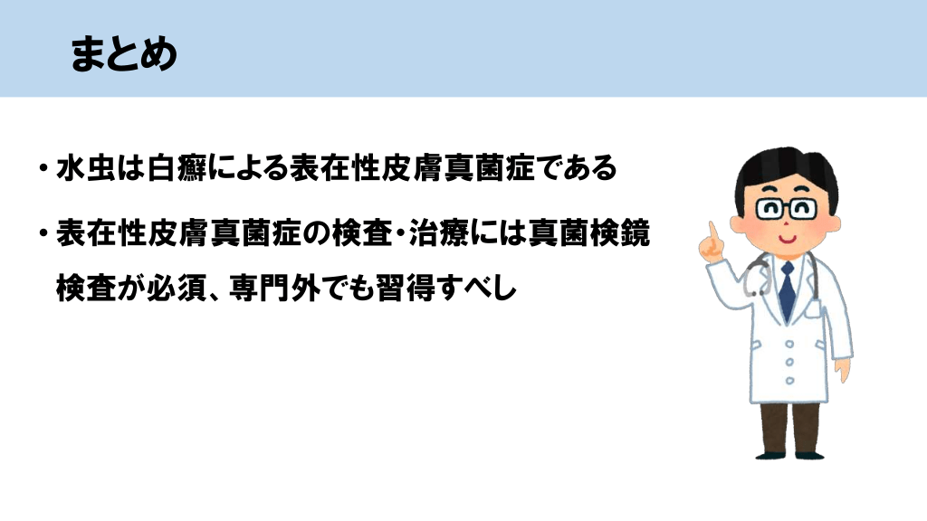 #14. まとめ • 水虫は白癬による表在性皮膚真菌症である • 表在性皮膚真菌症の検査・治療には真菌検鏡 検査が必須、専門外でも習得すべし