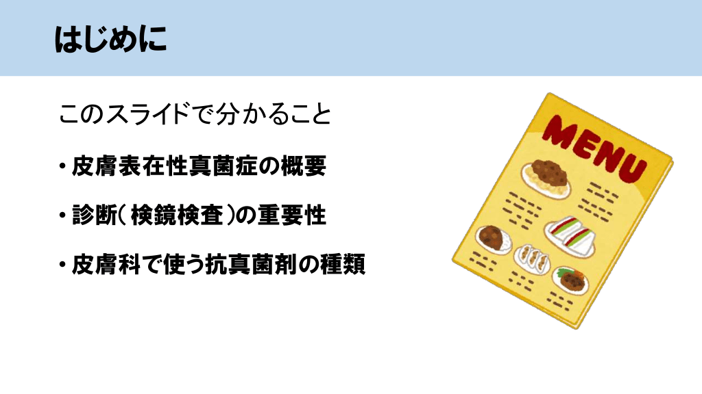 #2. はじめに このスライドで分かること • 皮膚表在性真菌症の概要 • 診断(検鏡検査)の重要性 • 皮膚科で使う抗真菌剤の種類