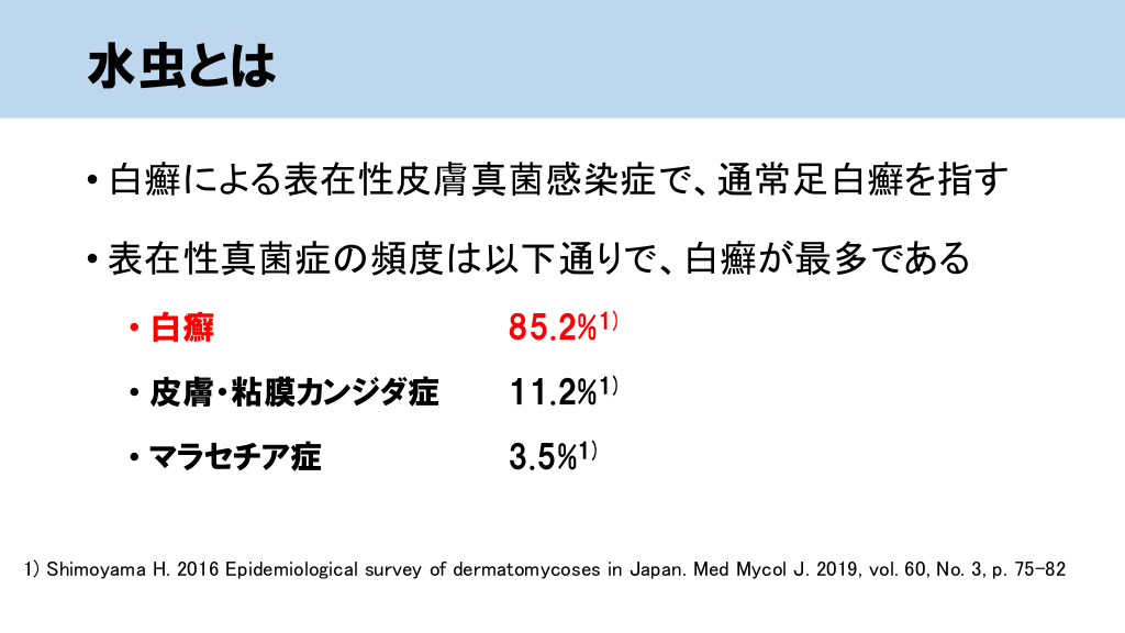#3. 水虫とは • 白癬による表在性皮膚真菌感染症で、通常足白癬を指す • 表在性真菌症の頻度は以下通りで、白癬が最多である • 白癬 85.2%1) • 皮膚・粘膜カンジダ症 11.2%1) • マラセチア症 3.5%1) 1) Shimoyama H. 2016 Epidemiological survey of dermatomycoses in Japan. Med Mycol J. 2019, vol. 60, No. 3, p. 75-82