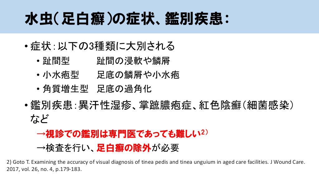 #4. 水虫(足白癬)の症状、鑑別疾患: • 症状:以下の3種類に大別される • 趾間型 • 小水疱型 趾間の浸軟や鱗屑 足底の鱗屑や小水疱 • 角質増生型 足底の過角化 • 鑑別疾患:異汗性湿疹、掌蹠膿疱症、紅色陰癬(細菌感染) など →視診での鑑別は専門医であっても難しい2) →検査を行い、足白癬の除外が必要 2) Goto T. Examining the accuracy of visual diagnosis of tinea pedis and tinea unguium in aged care facilities. J Wound Care. 2017, vol. 26, no. 4, p.179-183.