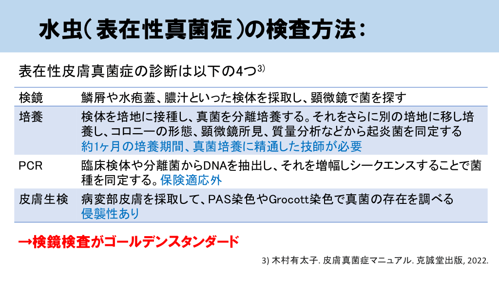 #5. 水虫(表在性真菌症)の検査方法: 表在性皮膚真菌症の診断は以下の4つ3) 検鏡 培養 鱗屑や水疱蓋、膿汁といった検体を採取し、顕微鏡で菌を探す 検体を培地に接種し、真菌を分離培養する。それをさらに別の培地に移し培 養し、コロニーの形態、顕微鏡所見、質量分析などから起炎菌を同定する 約1ヶ月の培養期間、真菌培養に精通した技師が必要 PCR 臨床検体や分離菌からDNAを抽出し、それを増幅しシークエンスすることで菌 種を同定する。保険適応外 病変部皮膚を採取して、PAS染色やGrocott染色で真菌の存在を調べる 侵襲性あり 皮膚生検 →検鏡検査がゴールデンスタンダード 3) 木村有太子. 皮膚真菌症マニュアル. 克誠堂出版, 2022.