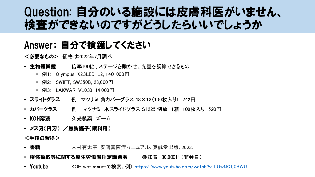 #6. Question: 自分のいる施設には皮膚科医がいません、 検査ができないのですがどうしたらいいでしょうか Answer: 自分で検鏡してください <必要なもの> 価格は2022年7月調べ • 生物顕微鏡 倍率100倍、ステージを動かせ、光量を調節できるもの • 例1: Olympus, X23LED-L2, 140, 000円 • 例2: SWIFT, SW350B, 28,000円 • 例3: LAKWAR, VL030, 14,000円 • スライドグラス 例: マツナミ 角カバーグラス 18×18(100枚入り) 742円 • カバーグラス 例: マツナミ 水スライドグラス S1225 切放 1箱 100枚入り 520円 • KOH溶液 久光製薬 ズーム • メス刃(円刃) /無鈎鑷子(眼科用) <手技の習得> • 書籍 木村有太子. 皮膚真菌症マニュアル. 克誠堂出版, 2022. • 検体採取等に関する厚生労働省指定講習会 • Youtube 参加費 30,000円(非会員) KOH wet mountで検索、例) https://www.youtube.com/watch?v=LUwNQI_0BWU