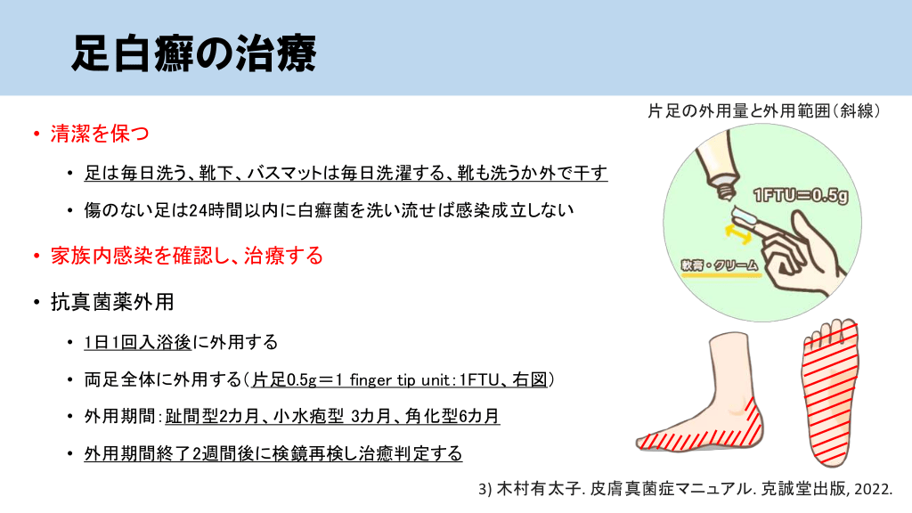 #7. 足白癬の治療 片足の外用量と外用範囲(斜線) • 清潔を保つ • 足は毎日洗う、靴下、バスマットは毎日洗濯する、靴も洗うか外で干す • 傷のない足は24時間以内に白癬菌を洗い流せば感染成立しない • 家族内感染を確認し、治療する • 抗真菌薬外用 • 1日1回入浴後に外用する • 両足全体に外用する(片足0.5g=1 finger tip unit:1FTU、右図) • 外用期間:趾間型2カ月、小水疱型 3カ月、角化型6カ月 • 外用期間終了2週間後に検鏡再検し治癒判定する 3) 木村有太子. 皮膚真菌症マニュアル. 克誠堂出版, 2022.