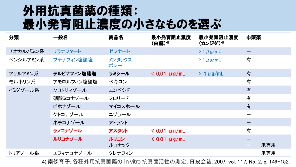 #8. 外用抗真菌薬の種類: 最小発育阻止濃度の小さなものを選ぶ 分類 一般名 商品名 チオカルバミン系 リラナフタート ベンジルアミン系 最小発育阻止濃度 (カンジダ)4) 市販薬 ゼフナート > 1μg/mL - ブテナフィン塩酸塩 メンタックス ボレー > 1μg/mL 有 アリルアミン系 テルビナフィン塩酸塩 ラミシール > 1μg/mL 有 モルホリン系 アモロルフィン塩酸塩 ぺキロン 有 イミダゾール系 クロトリマゾール エンペシド 有 硝酸ミコナゾール フロリード 有 ビホナゾール マイコスポール 有 ケトコナゾール ニゾラール - ネチコナゾール アトラント - ラノコナゾール アスタット < 0.01 μg/mL 有 ルリコナゾール ルリコン ルコナック < 0.01 μg/mL - - 爪専用 - 爪専用 トリアゾール系 エフィナコナゾール クレナフィン 最小発育阻止濃度 (白癬)4) < 0.01 μg/mL 4) 南條育子. 各種外用抗真菌薬の in vitro 抗真菌活性の測定. 日皮会誌. 2007, vol. 117, No. 2, p. 149-152.