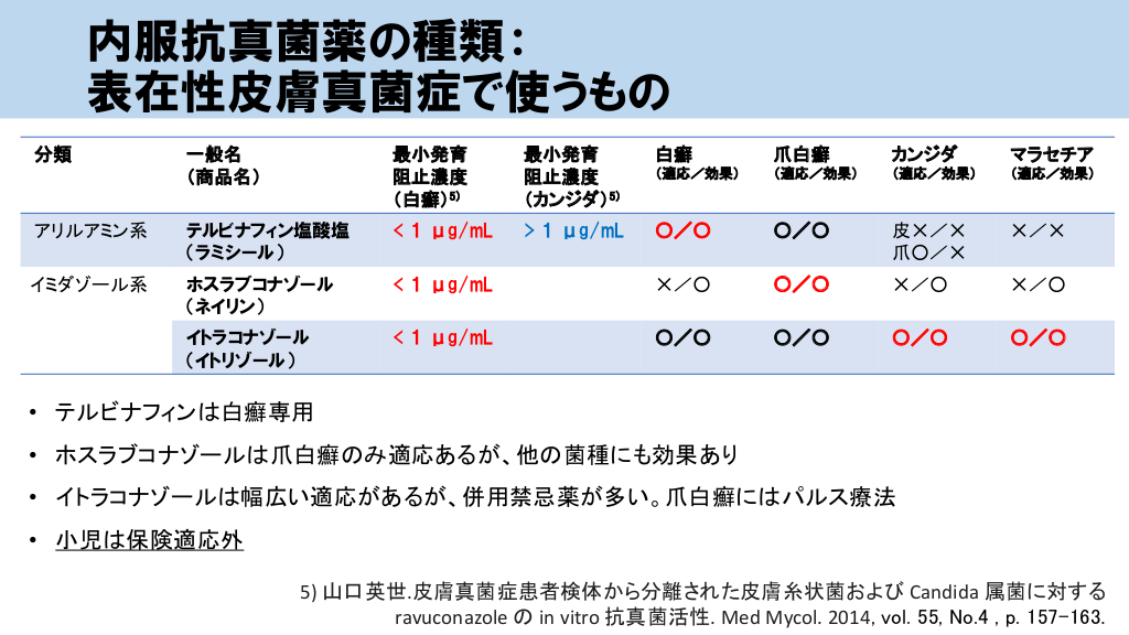 #9. 内服抗真菌薬の種類: 表在性皮膚真菌症で使うもの 分類 一般名 (商品名) 最小発育 阻止濃度 (白癬)5) 最小発育 阻止濃度 (カンジダ)5) 白癬 爪白癬 カンジダ マラセチア (適応/効果) (適応/効果) (適応/効果) (適応/効果) アリルアミン系 テルビナフィン塩酸塩 (ラミシール) < 1 μg/mL > 1 μg/mL ○/○ ○/○ 皮✕/✕ 爪○/✕ ✕/✕ イミダゾール系 ホスラブコナゾール (ネイリン) < 1 μg/mL ✕/○ ○/○ ✕/○ ✕/○ イトラコナゾール (イトリゾール) < 1 μg/mL ○/○ ○/○ ○/○ ○/○ • テルビナフィンは白癬専用 • ホスラブコナゾールは爪白癬のみ適応あるが、他の菌種にも効果あり • イトラコナゾールは幅広い適応があるが、併用禁忌薬が多い。爪白癬にはパルス療法 • 小児は保険適応外 5) 山口英世.皮膚真菌症患者検体から分離された皮膚糸状菌および Candida 属菌に対する ravuconazole の in vitro 抗真菌活性. Med Mycol. 2014, vol. 55, No.4 , p. 157-163.