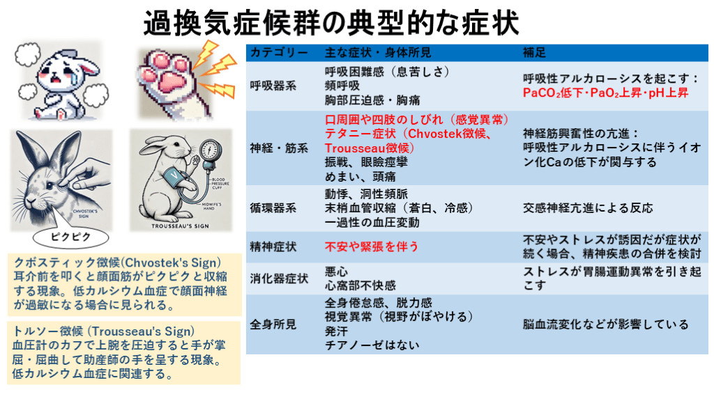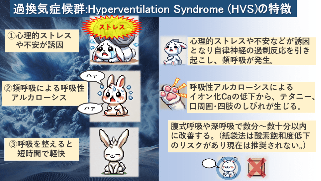 口周囲・四肢のしびれが生じる。 腹式呼吸や深呼吸で数分~数十分以内に改善する。(紙袋法は酸素飽和度低下のリスクがあり現在は推奨されない。)