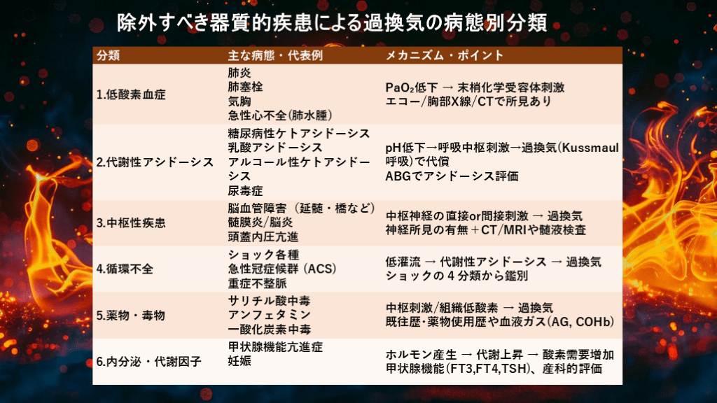 ➤呼吸器や循環器、神経系、代謝系などの器質的疾患や病態が背景に存在し、それによって過換気が引き起こされる状態 器質的疾患を伴わない過換気