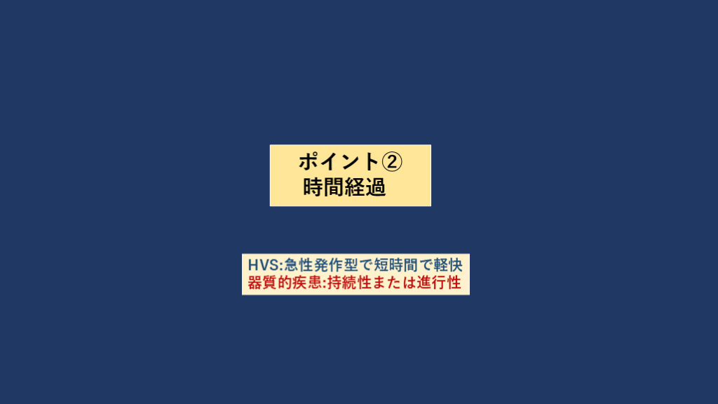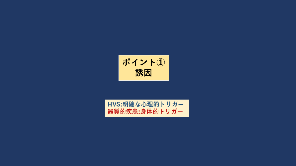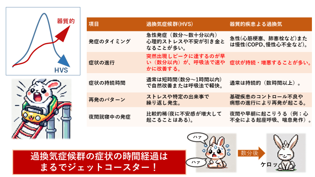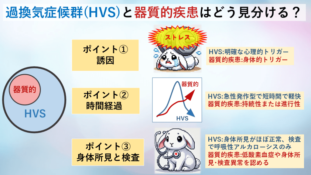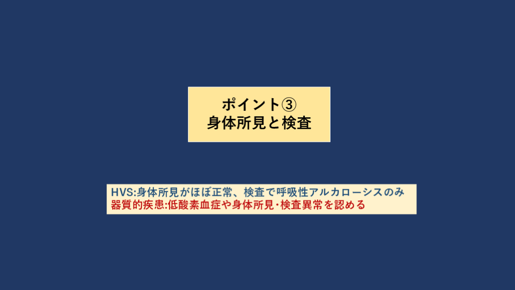 器質的疾患:持続性または進行性 ストレス HVS:身体所見がほぼ正常、検査で呼吸性アルカローシスのみ