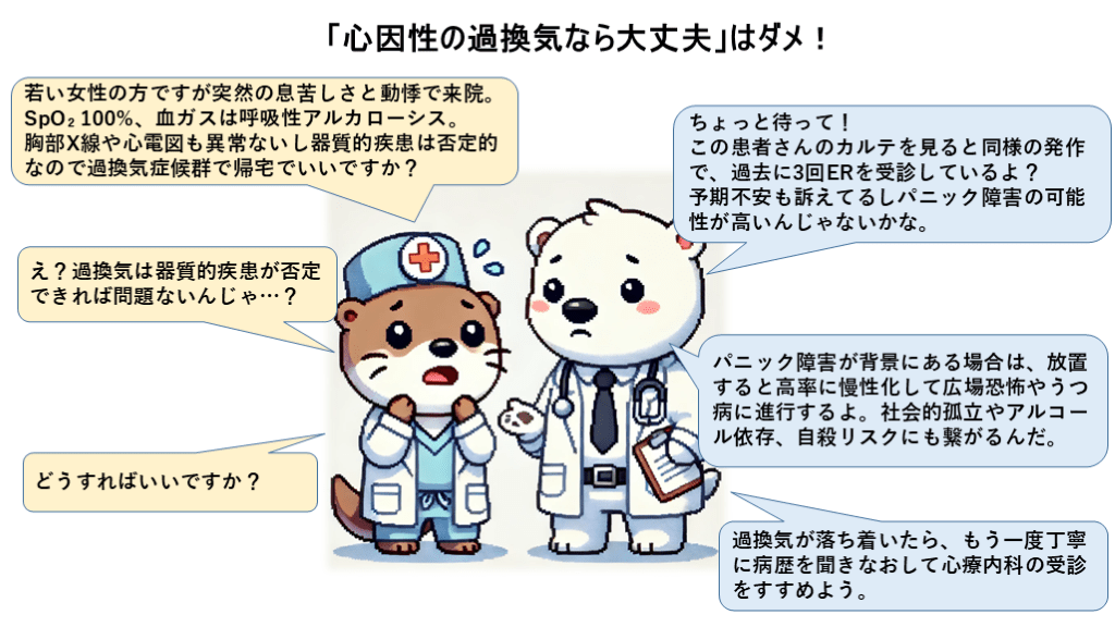 胸部X線や心電図も異常ないし器質的疾患は否定的なので過換気症候群で帰宅でいいですか? え?過換気は器質的疾患が否定できれば問題ないんじゃ…? パニック障害が背景にある場合は、放置すると高率に慢性化して広場恐怖やうつ病に進行するよ。社会的孤立やアルコール依存、自殺リスクにも繋がるんだ。 「心因性の過換気なら大丈夫」はダメ! どうすればいいですか? 過換気が落ち着いたら、もう一度丁寧に病歴を聞きなおして心療内科の受診をすすめよう。