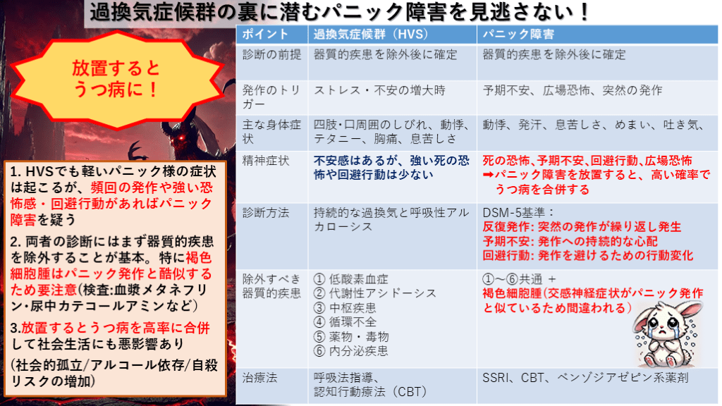 2. 両者の診断にはまず器質的疾患を除外することが基本。特に褐色細胞腫はパニック発作と酷似するため要注意(検査:血漿メタネフリン・尿中カテコールアミンなど)