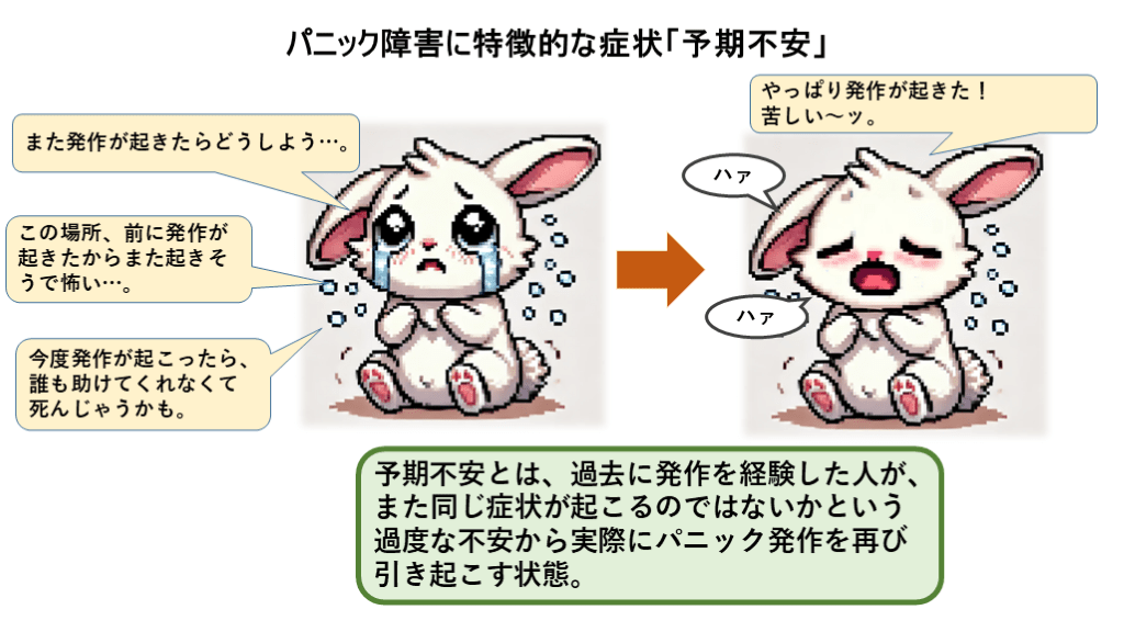 #23. また発作が起きたらどうしよう…。 パニック障害に特徴的な症状「予期不安」 今度発作が起こったら、誰も助けてくれなくて死んじゃうかも。 この場所、前に発作が起きたからまた起きそうで怖い…。 予期不安とは、過去に発作を経験した人が、また同じ症状が起こるのではないかという過度な不安から実際にパニック発作を再び引き起こす状態。 やっぱり発作が起きた!