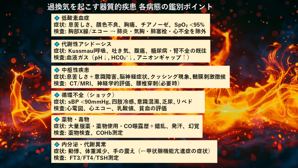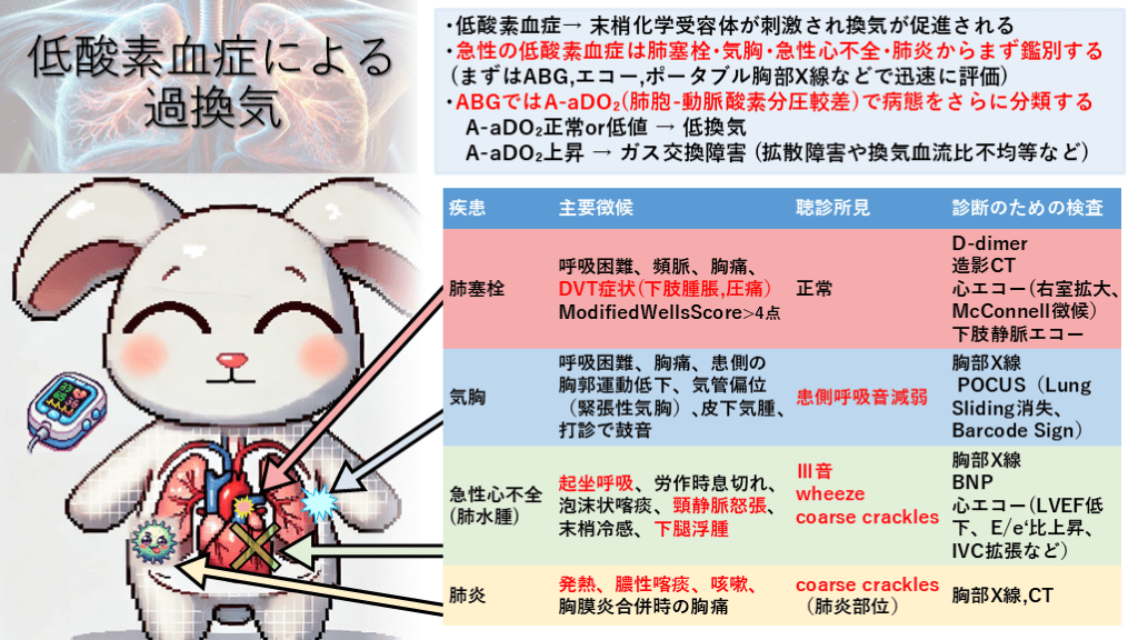 #25. 過換気を起こす器質的疾患 各病態の鑑別ポイント 🔹 低酸素血症