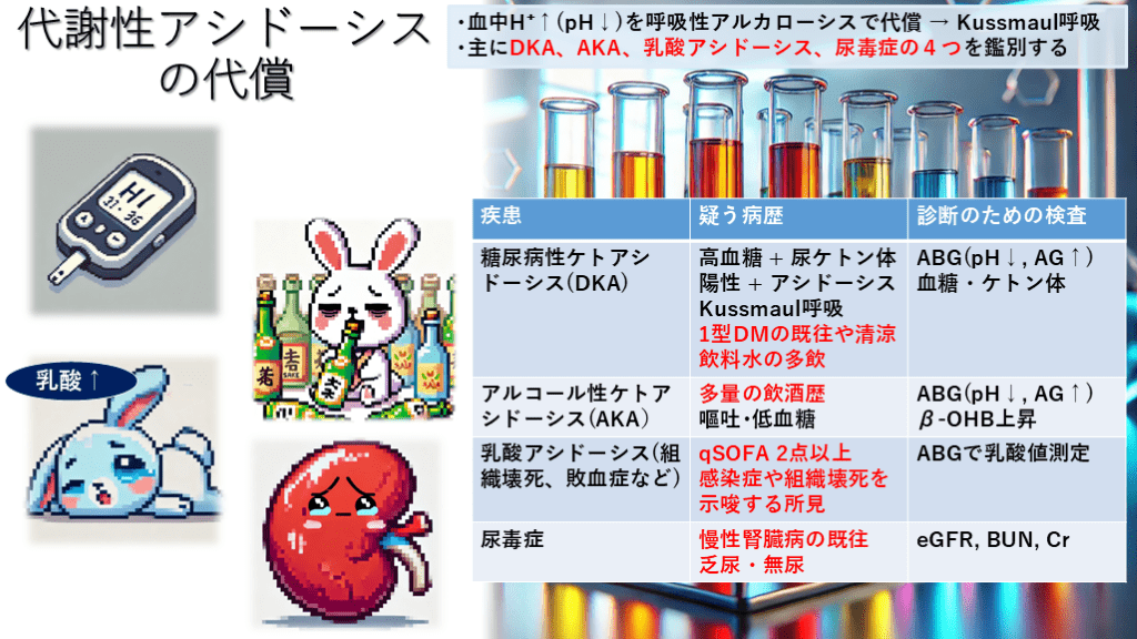 検査: 胸部X線/エコー → 肺炎・気胸・肺塞栓・心不全を除外 🔹 代謝性アシドーシス