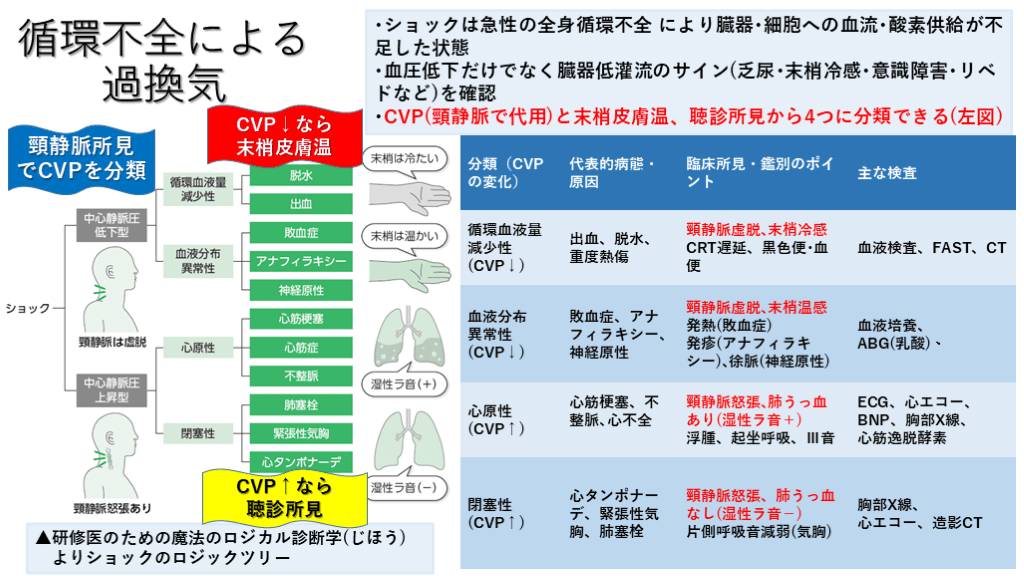・CVP(頸静脈で代用)と末梢皮膚温、聴診所見から4つに分類できる(左図) ▲研修医のための魔法のロジカル診断学(じほう)
