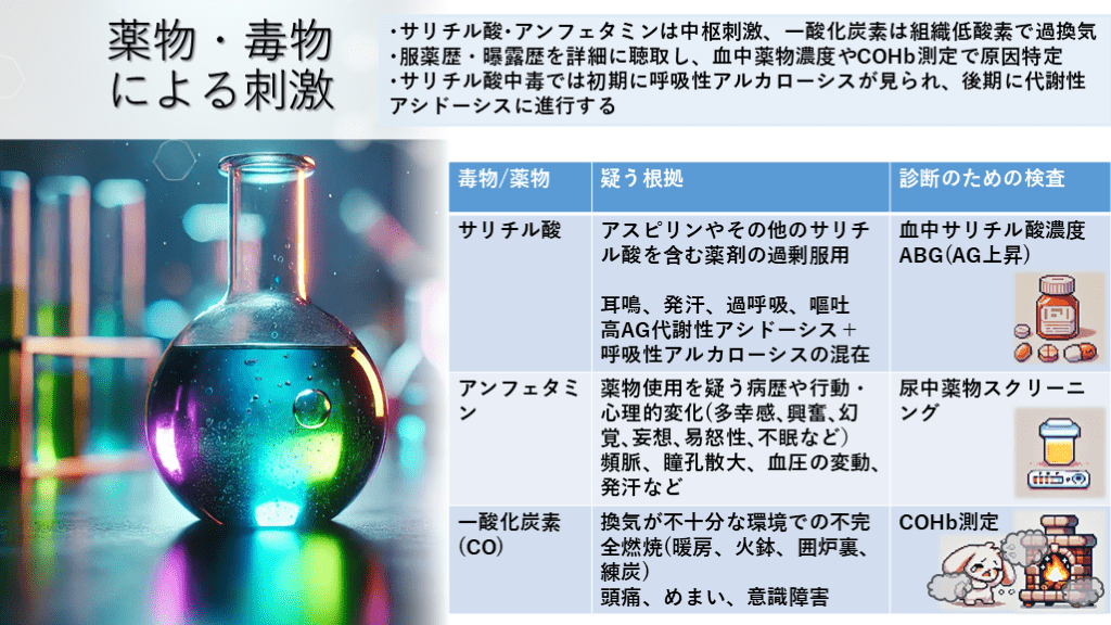 による刺激 ・サリチル酸・アンフェタミンは中枢刺激、一酸化炭素は組織低酸素で過換気