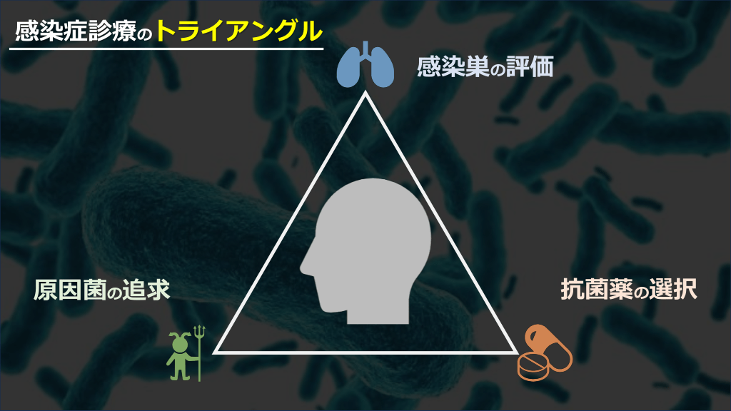 感染症診療のトライアングル 感染巣の評価 原因菌の追求 抗菌薬の選択 感染症診療の原則と市中肺炎の評価 #11.