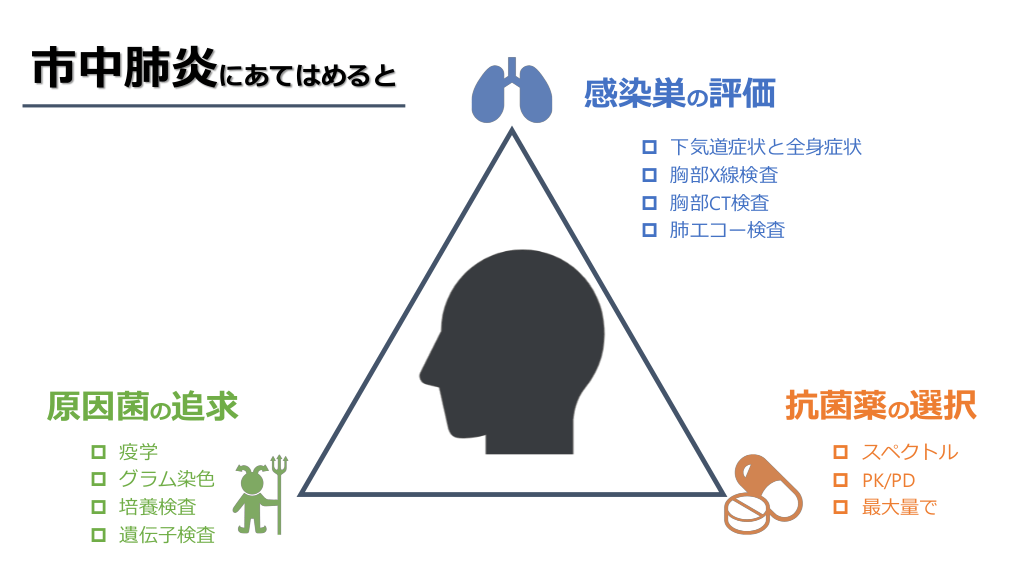 市中肺炎にあてはめると 感染巣の評価 原因菌の追求 疫学 グラム染色 培養検査 遺伝子検査 下気道症状と全身症状 胸部X線検査 胸部CT検査 肺エコー検査 抗菌薬の選択 スペクトル PK/PD 最大量で #13.