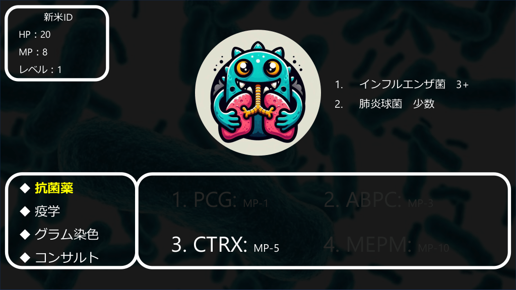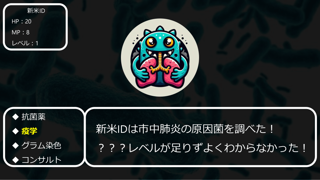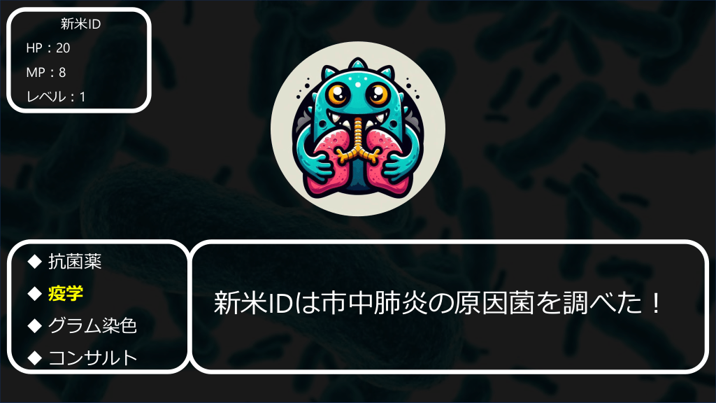 新米ID HP:20 MP:8 レベル:1 ◆ 抗菌薬 ◆ 疫学 新米IDは市中肺炎の原因菌を調べた! ◆ グラム染色 ???レベルが足りずよくわからなかった! ◆ コンサルト #18.