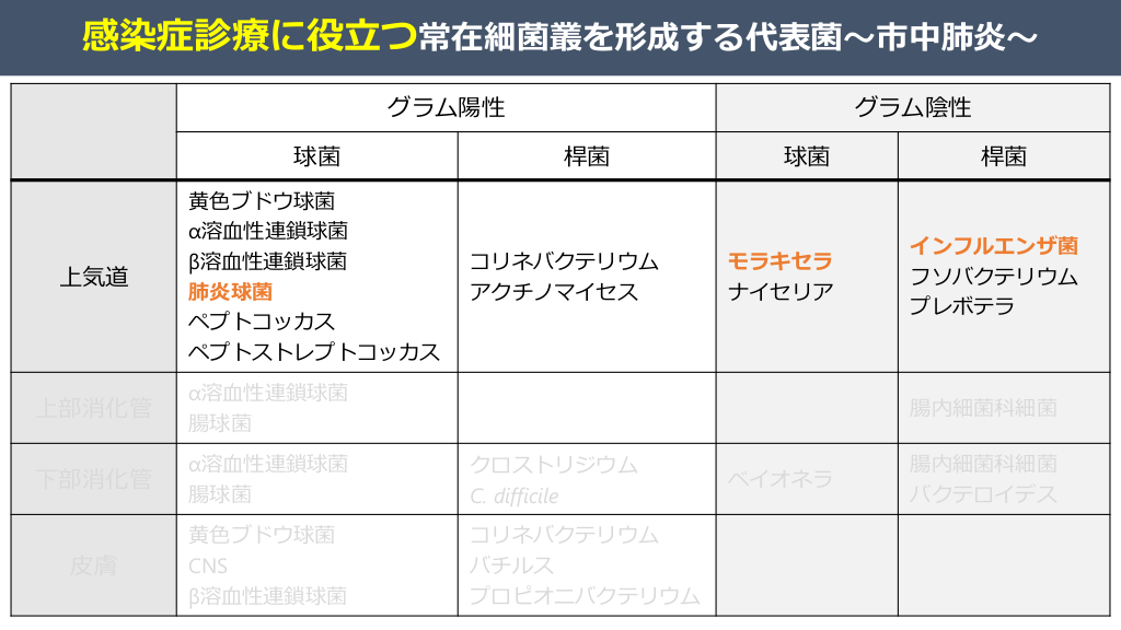 感染症診療に役立つ常在細菌叢を形成する代表菌~市中肺炎~ グラム陽性 球菌 上気道 黄色ブドウ球菌 α溶血性連鎖球菌 β溶血性連鎖球菌 肺炎球菌 ペプトコッカス ペプトストレプトコッカス グラム陰性 桿菌 コリネバクテリウム アクチノマイセス 上部消化管 α溶血性連鎖球菌 腸球菌 下部消化管 α溶血性連鎖球菌 腸球菌 クロストリジウム C. difficile 皮膚 黄色ブドウ球菌 CNS β溶血性連鎖球菌 コリネバクテリウム バチルス プロピオニバクテリウム 球菌 モラキセラ ナイセリア 桿菌 インフルエンザ菌 フソバクテリウム プレボテラ 腸内細菌科細菌 ベイオネラ 腸内細菌科細菌 バクテロイデス #16.