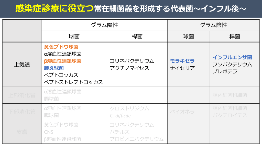感染症診療に役立つ常在細菌叢を形成する代表菌~インフル後~ グラム陽性 球菌 上気道 黄色ブドウ球菌 α溶血性連鎖球菌 β溶血性連鎖球菌 肺炎球菌 ペプトコッカス ペプトストレプトコッカス グラム陰性 桿菌 コリネバクテリウム アクチノマイセス 上部消化管 α溶血性連鎖球菌 腸球菌 下部消化管 α溶血性連鎖球菌 腸球菌 クロストリジウム C. difficile 皮膚 黄色ブドウ球菌 CNS β溶血性連鎖球菌 コリネバクテリウム バチルス プロピオニバクテリウム 球菌 モラキセラ ナイセリア 桿菌 インフルエンザ菌 フソバクテリウム プレボテラ 腸内細菌科細菌 ベイオネラ 腸内細菌科細菌 バクテロイデス 喀痰グラム染色の有用性と結果 #17.