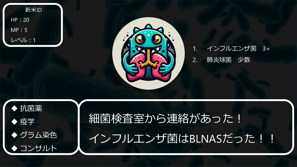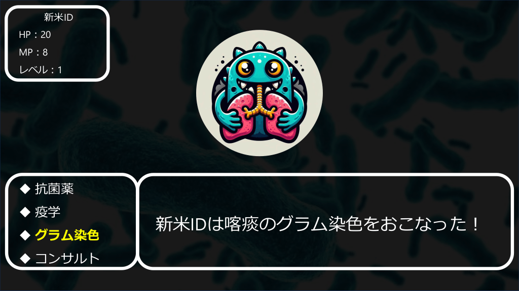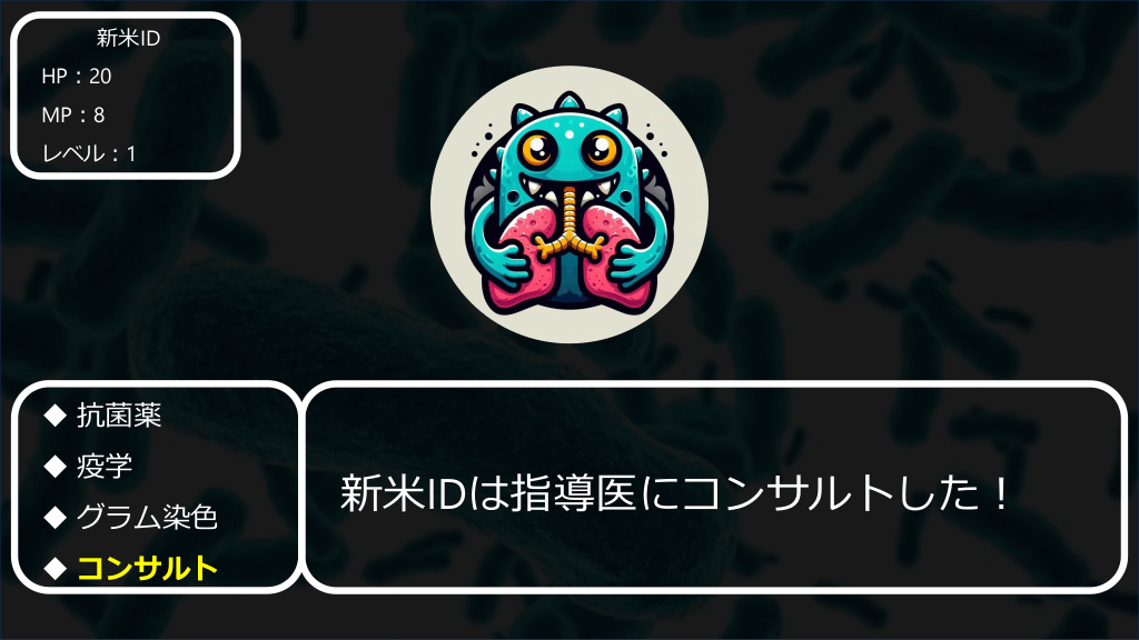 新米ID HP:20 MP:8 レベル:1 ◆ 抗菌薬 ◆ 疫学 ◆ グラム染色 ◆ コンサルト 新米IDは指導医にコンサルトした! #10.