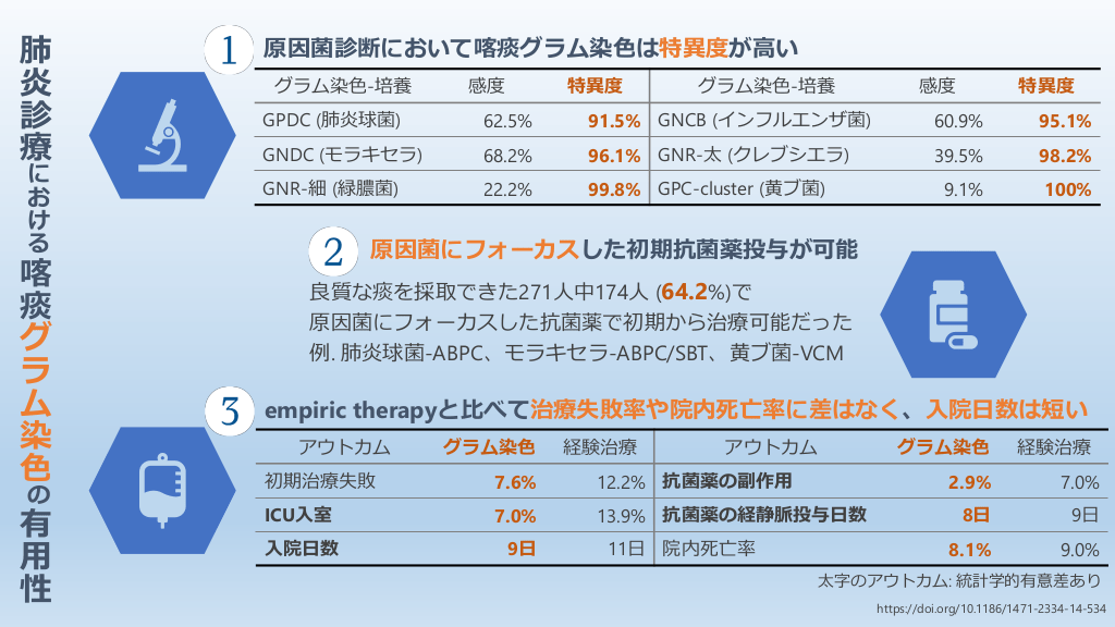 新米ID HP:20 MP:8 レベル:1 ◆ 抗菌薬 ◆ 疫学 ◆ グラム染色 ◆ コンサルト 新米IDは喀痰のグラム染色をおこなった! #19. 肺 炎 診 療 に お け る 喀 痰 グ ラ ム 染 色 の 有 用 性 原因菌診断において喀痰グラム染色は特異度が高い グラム染色-培養 感度 特異度 グラム染色-培養 感度 特異度 GPDC (肺炎球菌) 62.5% 91.5% GNCB (インフルエンザ菌) 60.9% 95.1% GNDC (モラキセラ) 68.2% 96.1% GNR-太 (クレブシエラ) 39.5% 98.2% GNR-細 (緑膿菌) 22.2% 99.8% GPC-cluster (黄ブ菌) 9.1% 100% 原因菌にフォーカスした初期抗菌薬投与が可能 良質な痰を採取できた271人中174人 (64.2%)で 原因菌にフォーカスした抗菌薬で初期から治療可能だった 例. 肺炎球菌-ABPC、モラキセラ-ABPC/SBT、黄ブ菌-VCM empiric therapyと比べて治療失敗率や院内死亡率に差はなく、入院日数は短い アウトカム グラム染色 経験治療 アウトカム グラム染色 初期治療失敗 7.6% 12.2% 抗菌薬の副作用 ICU入室 7.0% 13.9% 抗菌薬の経静脈投与日数 入院日数 9日 11日 院内死亡率 経験治療 2.9% 7.0% 8日 9日 8.1% 9.0% 太字のアウトカム: 統計学的有意差あり https://doi.org/10.1186/1471-2334-14-534 #20.