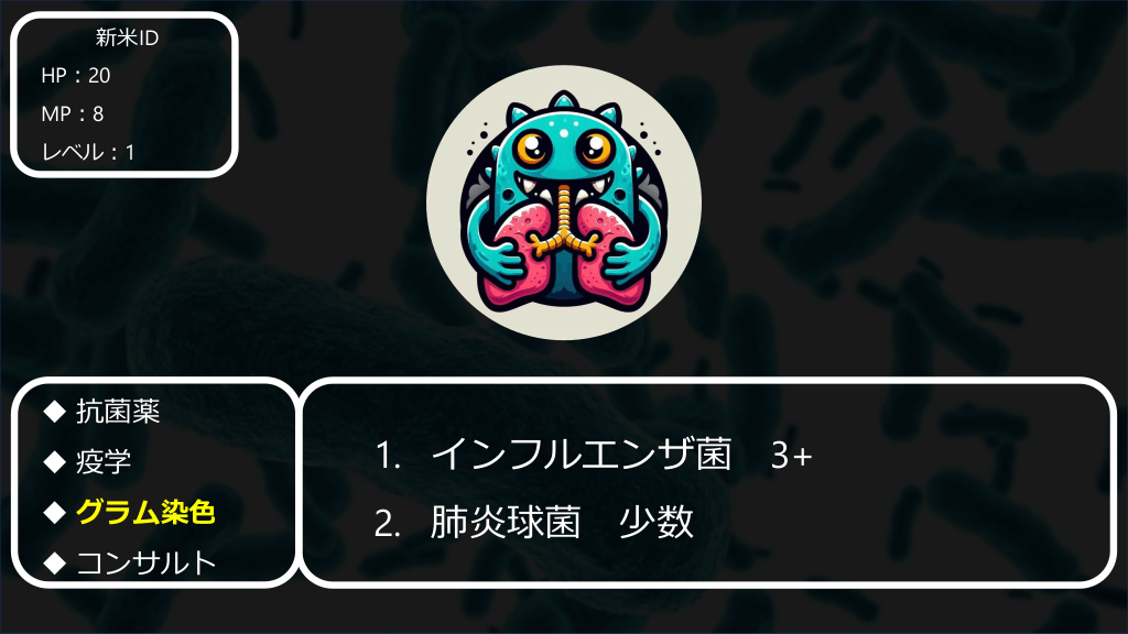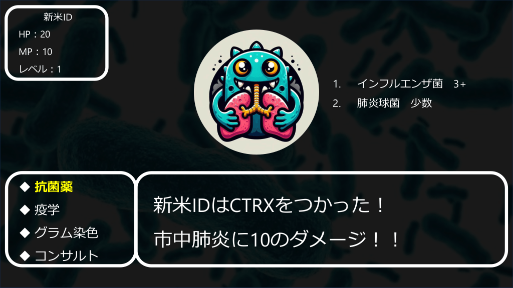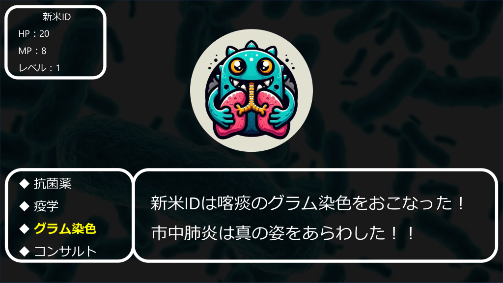新米ID HP:20 MP:8 レベル:1 ◆ 抗菌薬 ◆ 疫学 新米IDは喀痰のグラム染色をおこなった! ◆ グラム染色 市中肺炎は真の姿をあらわした!! ◆ コンサルト 抗菌薬の選択と治療の目的 #21.