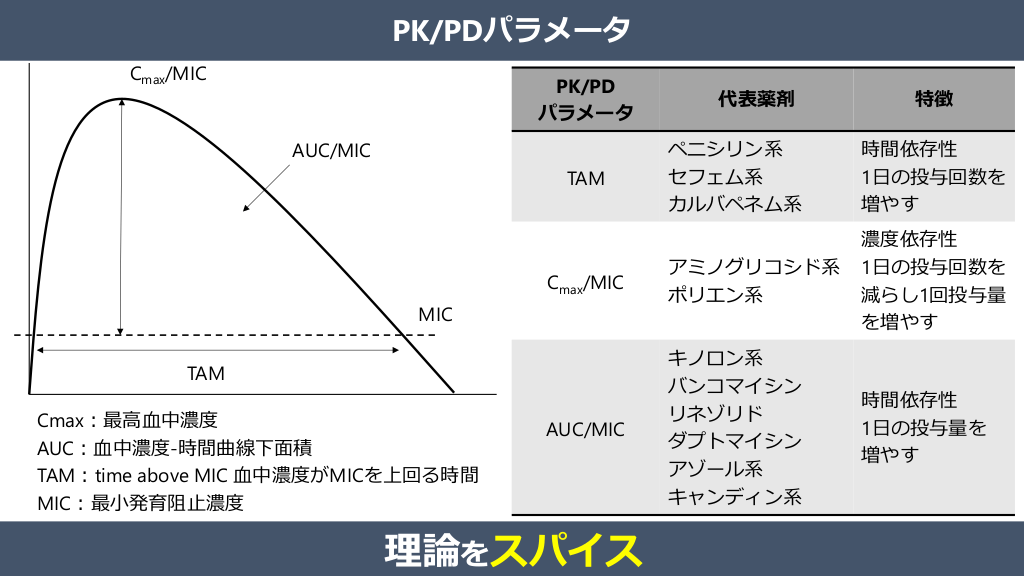 PK/PDパラメータ Cmax/MIC PK/PD パラメータ 特徴 ペニシリン系 セフェム系 カルバペネム系 時間依存性 1日の投与回数を 増やす Cmax/MIC アミノグリコシド系 ポリエン系 濃度依存性 1日の投与回数を 減らし1回投与量 を増やす AUC/MIC キノロン系 バンコマイシン リネゾリド ダプトマイシン アゾール系 キャンディン系 時間依存性 1日の投与量を 増やす AUC/MIC TAM MIC TAM Cmax:最高血中濃度 AUC:血中濃度-時間曲線下面積 TAM:time above MIC 血中濃度がMICを上回る時間 MIC:最小発育阻止濃度 代表薬剤 理論をスパイス #28.