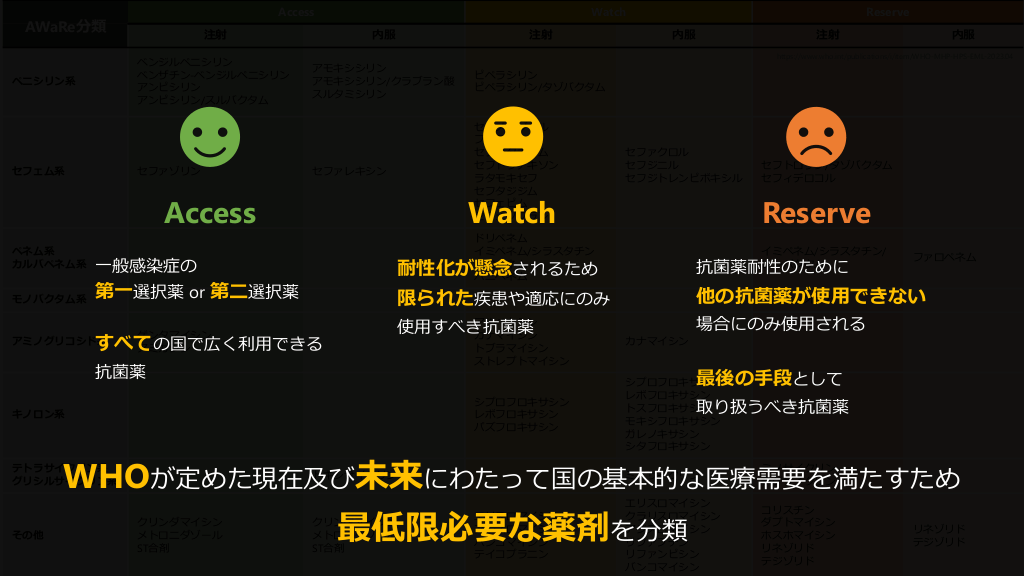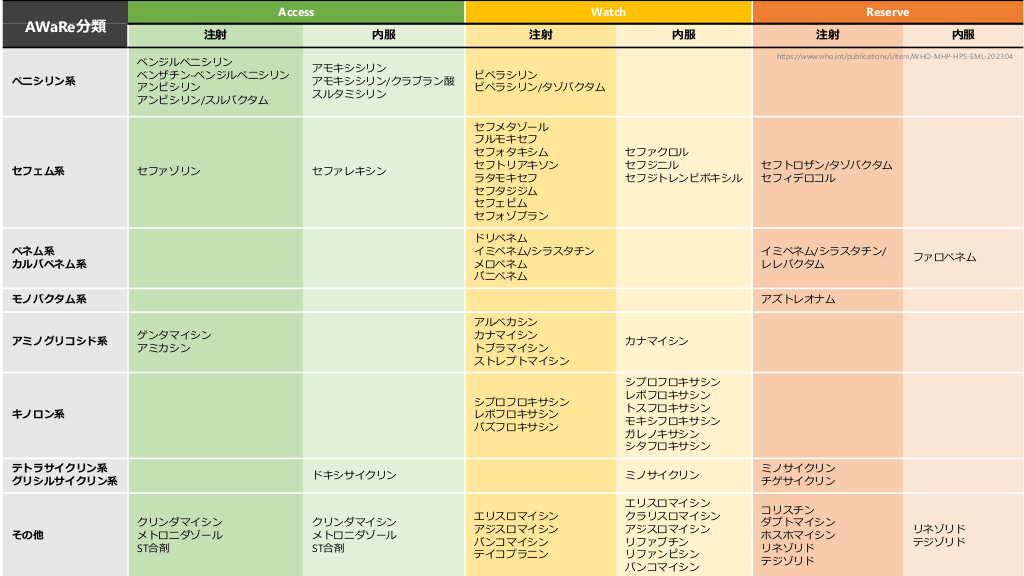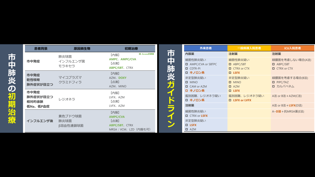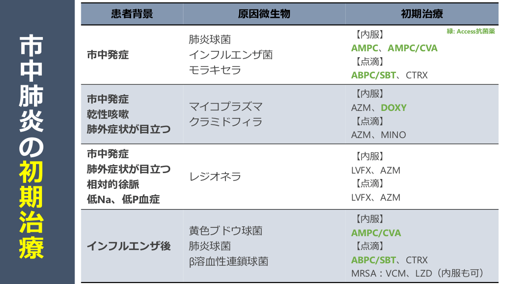 患者背景 市 中 肺 炎 の 初 期 治 療 市中発症 市中発症 乾性咳嗽 肺外症状が目立つ 市中発症 肺外症状が目立つ 相対的徐脈 低Na、低P血症 インフルエンザ後 原因微生物 初期治療 緑: Access抗菌薬 肺炎球菌 インフルエンザ菌 モラキセラ 【内服】 AMPC、AMPC/CVA 【点滴】 ABPC/SBT、CTRX マイコプラズマ クラミドフィラ 【内服】 AZM、DOXY 【点滴】 AZM、MINO レジオネラ 【内服】 LVFX、AZM 【点滴】 LVFX、AZM 黄色ブドウ球菌 肺炎球菌 β溶血性連鎖球菌 【内服】 AMPC/CVA 【点滴】 ABPC/SBT、CTRX MRSA:VCM、LZD(内服も可) #43. Access AWaRe分類 ペニシリン系 セフェム系 Watch 注射 内服 ベンジルペニシリン ベンザチン-ベンジルペニシリン アンピシリン アンピシリン/スルバクタム アモキシシリン アモキシシリン/クラブラン酸 スルタミシリン ピペラシリン ピペラシリン/タゾバクタム セファレキシン セフメタゾール フルモキセフ セフォタキシム セフトリアキソン ラタモキセフ セフタジジム セフェピム セフォゾプラン セファゾリン Access 注射 Reserve 内服 注射 内服 https://www.who.int/publications/i/item/WHO-MHP-HPS-EML-2023.04 セファクロル セフジニル セフジトレンピボキシル Watch セフトロザン/タゾバクタム セフィデロコル Reserve ドリペネム イミペネム/シラスタチン メロペネム パニペネム ペネム系 カルバペネム系 一般感染症の 耐性化が懸念されるため 抗菌薬耐性のために モノバクタム系 第一選択薬 or 第二選択薬 限られた疾患や適応にのみ 他の抗菌薬が使用できない アズトレオナム アルベカシン 使用すべき抗菌薬 カナマイシン ゲンタマイシン アミカシン すべての国で広く利用できる アミノグリコシド系 トブラマイシン ストレプトマイシン 抗菌薬 シプロフロキサシン レボフロキサシン パズフロキサシン キノロン系 イミペネム/シラスタチン/ レレバクタム ファロペネム 場合にのみ使用される カナマイシン 最後の手段として シプロフロキサシン レボフロキサシン トスフロキサシン モキシフロキサシン ガレノキサシン シタフロキサシン 取り扱うべき抗菌薬 WHOが定めた現在及び未来にわたって国の基本的な医療需要を満たすため テトラサイクリン系 グリシルサイクリン系 その他 ドキシサイクリン クリンダマイシン メトロニダゾール ST合剤 ミノサイクリン ミノサイクリン チゲサイクリン エリスロマイシン クラリスロマイシン アジスロマイシン リファブチン リファンピシン バンコマイシン コリスチン ダプトマイシン ホスホマイシン リネゾリド テジゾリド 最低限必要な薬剤を分類 #44. Access AWaRe分類 ペニシリン系 セフェム系 Watch 注射 内服 ベンジルペニシリン ベンザチン-ベンジルペニシリン アンピシリン アンピシリン/スルバクタム アモキシシリン アモキシシリン/クラブラン酸 スルタミシリン ピペラシリン ピペラシリン/タゾバクタム セファレキシン セフメタゾール フルモキセフ セフォタキシム セフトリアキソン ラタモキセフ セフタジジム セフェピム セフォゾプラン セファゾリン 注射 Reserve 内服 セファクロル セフジニル セフジトレンピボキシル ファロペネム アズトレオナム ゲンタマイシン アミカシン キノロン系 テトラサイクリン系 グリシルサイクリン系 その他 セフトロザン/タゾバクタム セフィデロコル イミペネム/シラスタチン/ レレバクタム モノバクタム系 アミノグリコシド系 内服 https://www.who.int/publications/i/item/WHO-MHP-HPS-EML-2023.04 ドリペネム イミペネム/シラスタチン メロペネム パニペネム ペネム系 カルバペネム系 注射 アルベカシン カナマイシン トブラマイシン ストレプトマイシン カナマイシン シプロフロキサシン レボフロキサシン パズフロキサシン シプロフロキサシン レボフロキサシン トスフロキサシン モキシフロキサシン ガレノキサシン シタフロキサシン ドキシサイクリン クリンダマイシン メトロニダゾール ST合剤 クリンダマイシン メトロニダゾール ST合剤 エリスロマイシン アジスロマイシン バンコマイシン テイコプラニン ミノサイクリン ミノサイクリン チゲサイクリン エリスロマイシン クラリスロマイシン アジスロマイシン リファブチン リファンピシン バンコマイシン コリスチン ダプトマイシン ホスホマイシン リネゾリド テジゾリド リネゾリド テジゾリド #45.