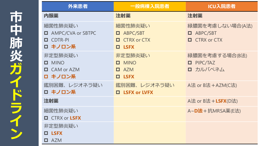 市 中 肺 炎 ガ イ ド ラ イ ン 外来患者 ICU入院患者 一般病棟入院患者 内服薬 注射薬 注射薬 細菌性肺炎疑い AMPC/CVA or SBTPC CDTR-PI キノロン系 細菌性肺炎疑い ABPC/SBT CTRX or CTX LSFX 緑膿菌を考慮しない場合(A法) ABPC/SBT CTRX or CTX 非定型肺炎疑い MINO CAM or AZM キノロン系 非定型肺炎疑い MINO AZM LSFX 緑膿菌を考慮する場合(B法) PIPC/TAZ カルバペネム 鑑別困難、レジオネラ疑い キノロン系 鑑別困難、レジオネラ疑い LSFX or LVFX A法 or B法+AZM(C法) 注射薬 A法 or B法+LSFX(D法) 細菌性肺炎疑い CTRX or LSFX A~D法+抗MRSA薬(E法) 非定型肺炎疑い LSFX AZM #31.