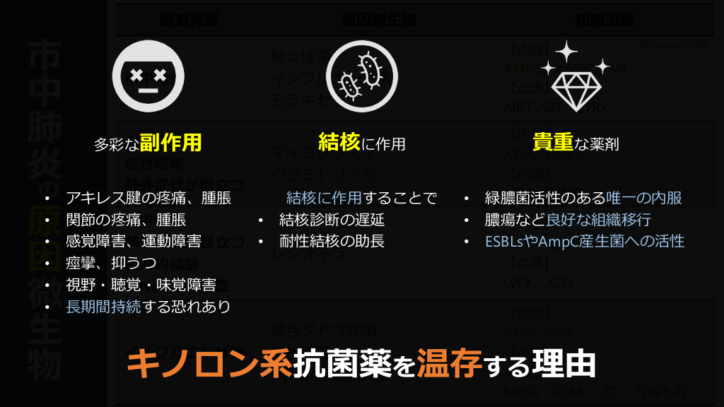 患者背景 市 中 肺 炎 の • • 原 • • 因 • 微 • 生 物 市中発症 原因微生物 初期治療 【内服】 AMPC、AMPC/CVA 【点滴】 ABPC/SBT、CTRX 肺炎球菌 インフルエンザ菌 モラキセラ 市中発症 結核に作用 多彩な 副作用 マイコプラズマ 乾性咳嗽 クラミドフィラ 肺外症状が目立つ アキレス腱の疼痛、腫脹 結核に作用することで 関節の疼痛、腫脹 • 結核診断の遅延 市中発症 感覚障害、運動障害 肺外症状が目立つ • 耐性結核の助長 レジオネラ 痙攣、抑うつ 相対的徐脈 視野・聴覚・味覚障害 低Na、低P血症 長期間持続する恐れあり 黄色ブドウ球菌 肺炎球菌 β溶血性連鎖球菌 • • • 【内服】 貴重な薬剤 AZM、DOXY 【点滴】 AZM、MINO 緑膿菌活性のある唯一の内服 膿瘍など良好な組織移行 【内服】 ESBLsやAmpC産生菌への活性 LVFX、AZM 【点滴】 LVFX、AZM 【内服】 AMPC/CVA 【点滴】 ABPC/SBT MRSA:VCM、LZD(内服も可) キノロン系抗菌薬を温存する理由 インフルエンザ後 緑: Access抗菌薬 #32.