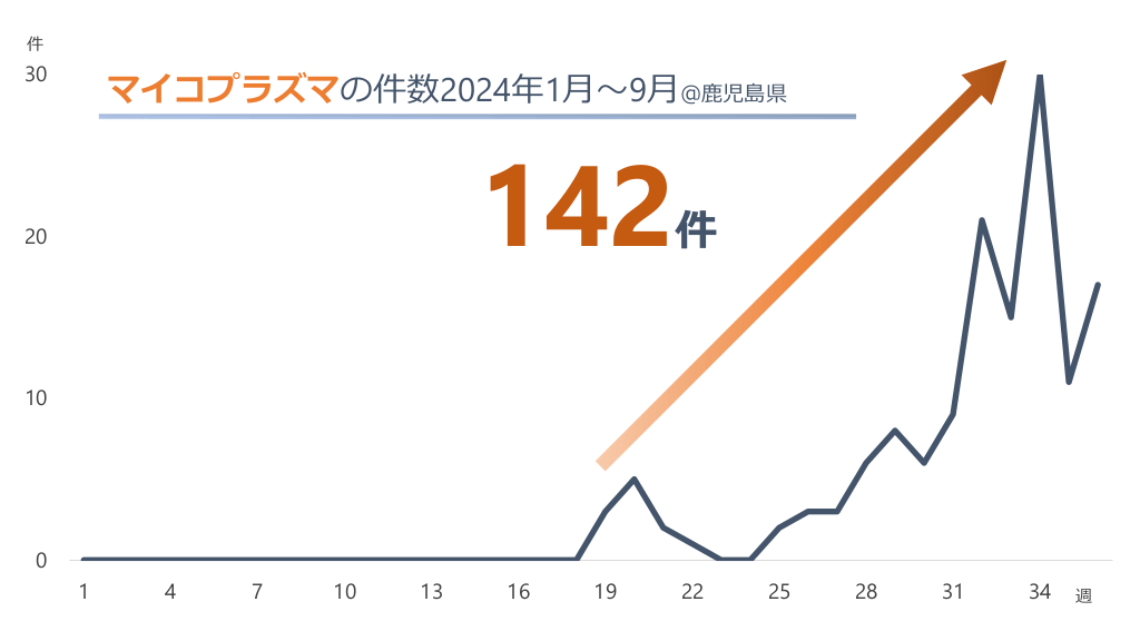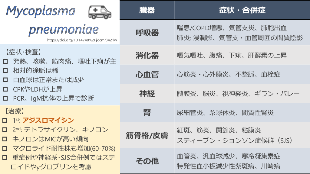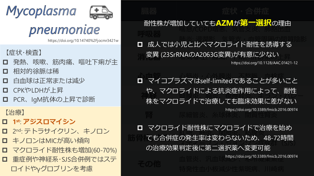 件 30 マイコプラズマの件数2024年1月~9月@鹿児島県 142 件 20 10 0 1 4 7 10 13 16 19 22 25 28 31 34 週 マイコプラズマ肺炎の症状と治療 #33. Mycoplasma pneumoniae 臓器 呼吸器 https://doi.org/10.14740%2Fjocmr3421w 症状・合併症 喘息/COPD増悪、気管支炎、肺胞出血 肺炎: 浸潤影、気管支・血管周囲の間質陰影 【症状・検査】 発熱、咳嗽、筋肉痛、嘔吐下痢が主 相対的徐脈は稀 白血球は正常または減少 CPKやLDHが上昇 PCR、IgM抗体の上昇で診断 消化器 嘔気嘔吐、腹痛、下痢、肝酵素の上昇 心血管 心筋炎・心外膜炎、不整脈、血栓症 【治療】 1st: アジスロマイシン 2nd: テトラサイクリン、キノロン キノロンはMICが高い傾向 マクロライド耐性株も増加(60-70%) 重症例や神経系・SJS合併例ではステ ロイドやγグロブリンを考慮 腎 神経 筋骨格/皮膚 その他 髄膜炎、脳炎、視神経炎、ギラン・バレー 尿細管炎、糸球体炎、間質性腎炎 紅斑、筋炎、関節炎、粘膜炎 スティーブン・ジョンソン症候群(SJS) 血管炎、汎血球減少、寒冷凝集素症 特発性血小板減少性紫斑病、川崎病 #34. Mycoplasma pneumoniae https://doi.org/10.14740%2Fjocmr3421w 【症状・検査】 発熱、咳嗽、筋肉痛、嘔吐下痢が主 相対的徐脈は稀 白血球は正常または減少 CPKやLDHが上昇 PCR、IgM抗体の上昇で診断 【治療】 1st: アジスロマイシン 2nd: テトラサイクリン、キノロン キノロンはMICが高い傾向 マクロライド耐性株も増加(60-70%) 重症例や神経系・SJS合併例ではステ ロイドやγグロブリンを考慮 臓器 症状・合併症 耐性株が増加していてもAZMが第一選択の理由 喘息/COPD増悪、気管支炎、肺胞出血 呼吸器 肺炎: 浸潤影、気管支・血管周囲の間質陰影 成人では小児と比べマクロライド耐性を誘導する 変異 (23SrRNAのA2063G変異)が有意に少ない 嘔気嘔吐、腹痛、下痢、肝酵素の上昇 消化器 https://doi.org/10.1128/AAC.01421-12 心筋炎・心外膜炎、不整脈、血栓症 心血管 マイコプラズマはself-limitedであることが多いこと や、マクロライドによる抗炎症作用によって、耐性 髄膜炎、脳炎、視神経炎、ギラン・バレー 神経 株をマクロライドで治療しても臨床効果に差がない 腎 https://doi.org/10.3389/fmicb.2016.00974 尿細管炎、糸球体炎、間質性腎炎 マクロライド耐性株にマクロライドで治療を始め 紅斑、筋炎、関節炎、粘膜炎 ても合併症の発生率は変わらないため、48-72時間 筋骨格/皮膚 スティーブン・ジョンソン症候群(SJS) の治療効果判定後に第二選択薬へ変更可能 https://doi.org/10.3389/fmicb.2016.00974 その他 血管炎、汎血球減少、寒冷凝集素症 特発性血小板減少性紫斑病、川崎病 #36.