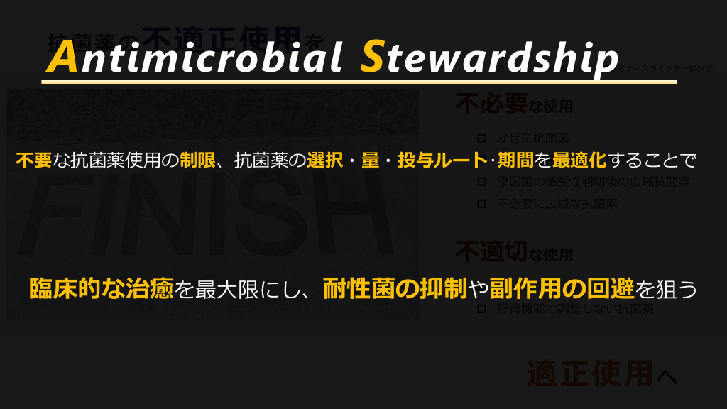 抗 菌 薬 の 不適正使用 を A ntimicrobial S tewardship 第46回抗菌薬適正使用生涯教育セミナースライドを一部改変 不必要な使用 かぜに抗菌薬 感染症診療の原則に基づき、抗菌薬の選択・量・投与ルート・期間 を最適化することで 無症候性細菌尿に抗菌薬 原因菌の感受性判明後の広域抗菌薬 不必要に広域な抗菌薬 不適切な使用 耐性菌に無効な抗菌薬 臨床的な治癒を最大限にし、耐性菌の抑制や 副作用の回避を狙う 肝腎機能で調整しない抗菌薬 適正使用 へ #55.
