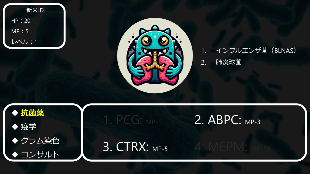 新米ID HP:20 MP:8 レベル:1 ◆ 抗菌薬 ◆ 疫学 1. インフルエンザ菌 3+ ◆ グラム染色 2. 肺炎球菌 少数 ◆ コンサルト #22.