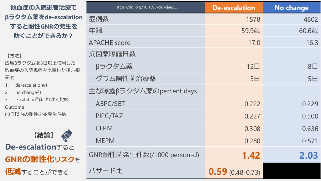 新米ID HP:20 MP:5 レベル:1 ◆ 抗菌薬 ◆ 疫学 ◆ グラム染色 ◆ コンサルト 1. インフルエンザ菌(BLNAS) 2. 肺炎球菌 1. PCG: MP-1 2. ABPC: MP-3 3. CTRX: MP-5 4. MEPM: MP-10 #48. 敗血症の入院患者治療で βラクタム薬をde-escalation すると耐性GNRの発生を 防ぐことができるか? https://doi.org/10.1093/cid/ciae253 症例数 De-escalation No change 1578 4802 59.9歳 60.6歳 17.0 16.3 12日 8日 5日 5日 ABPC/SBT 0.222 0.229 PIPC/TAZ 0.227 0.500 CFPM 0.308 0.636 MEPM 0.280 0.571 1.42 2.03 年齢 APACHE score 抗菌薬曝露日数 【方法】 広域βラクタムを3日以上使用した 敗血症の入院患者を比較した後方視 βラクタム薬 研究 グラム陽性菌治療薬 1. de-escalation群 2. no change群 3. escalation群にわけて比較 Outcome 60日以内の耐性GNR発生件数 【結論】 De-escalationすると GNRの耐性化リスクを 低減することができる 主な曝露βラクタム薬のpercent days GNR耐性菌発生件数(/1000 person-d) ハザード比 0.59 (0.48-0.73) #49.