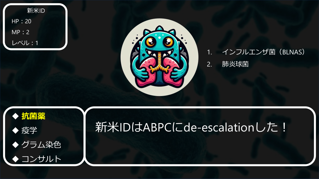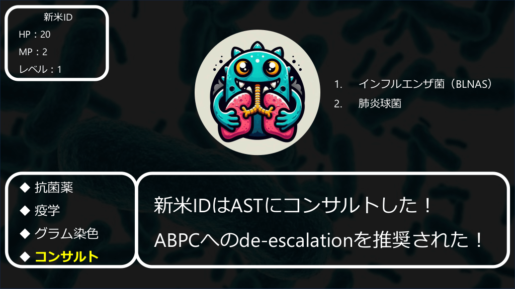 新米ID HP:20 MP:2 レベル:1 ◆ 抗菌薬 ◆ 疫学 ◆ グラム染色 ◆ コンサルト 1. インフルエンザ菌(BLNAS) 2. 肺炎球菌 新米IDはASTにコンサルトした! ABPCへのde-escalationを推奨された! #50.