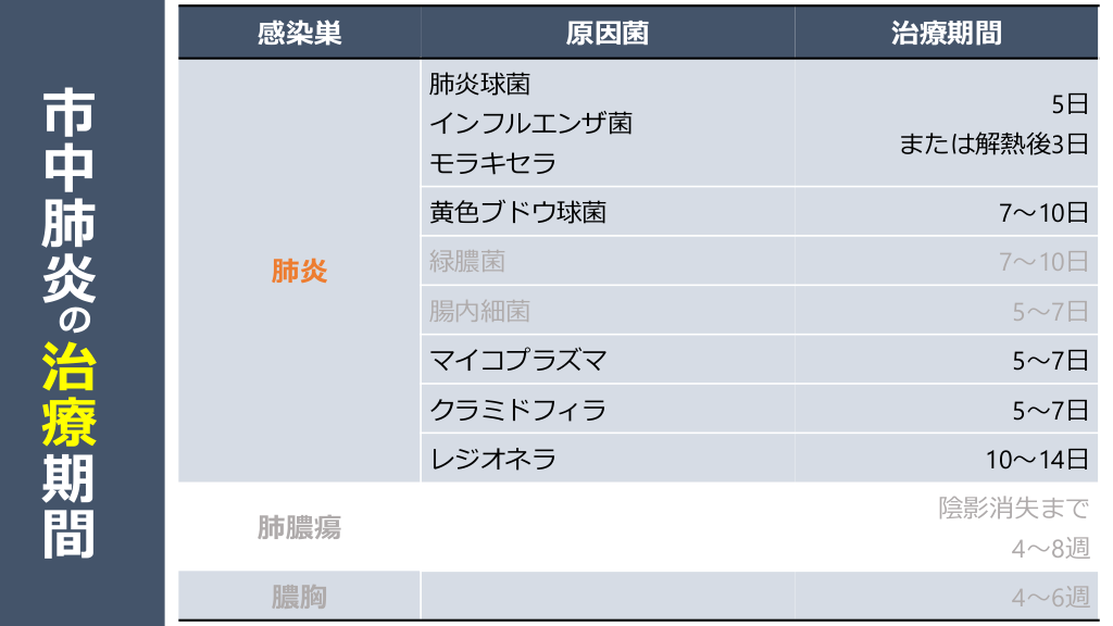 感染巣 市 中 肺 炎 肺炎球菌 インフルエンザ菌 モラキセラ 肺炎 の 治 療 期 間 原因菌 膿胸 5日 または解熱後3日 黄色ブドウ球菌 7~10日 緑膿菌 7~10日 腸内細菌 5~7日 マイコプラズマ 5~7日 クラミドフィラ 5~7日 レジオネラ 肺膿瘍 治療期間 10~14日 陰影消失まで 4~8週 4~6週 #52.