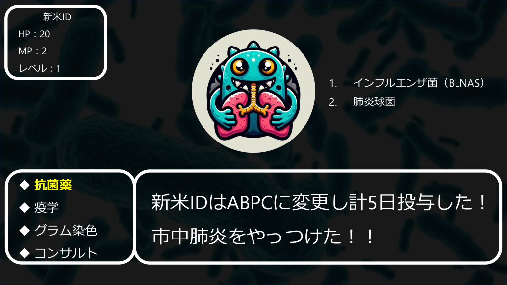 新米ID HP:20 MP:2 レベル:1 ◆ 抗菌薬 ◆ 疫学 ◆ グラム染色 ◆ コンサルト 1. インフルエンザ菌(BLNAS) 2. 肺炎球菌 新米IDはABPCに変更し計5日投与した! 市中肺炎をやっつけた!! #53.