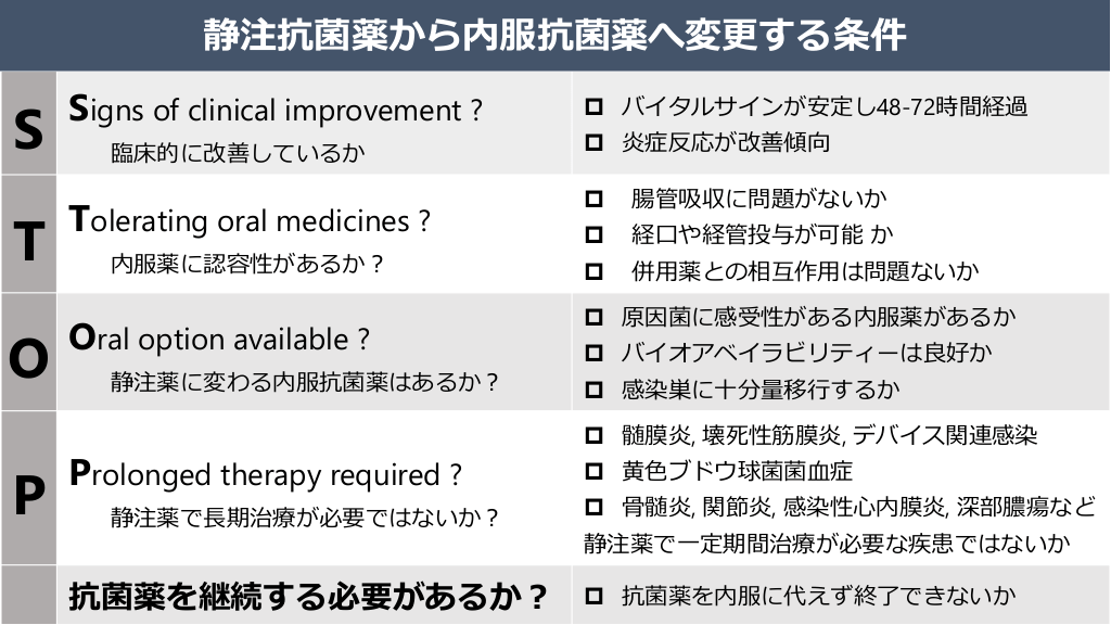 静注抗菌薬から内服抗菌薬へ変更する条件 S T O P Signs of clinical improvement ? 臨床的に改善しているか バイタルサインが安定し48-72時間経過 炎症反応が改善傾向 Tolerating oral medicines ? 腸管吸収に問題がないか 経口や経管投与が可能 か 内服薬に認容性があるか? 併用薬との相互作用は問題ないか Oral option available ? 静注薬に変わる内服抗菌薬はあるか? Prolonged therapy required ? 静注薬で長期治療が必要ではないか? 抗菌薬を継続する必要があるか? 原因菌に感受性がある内服薬があるか バイオアベイラビリティーは良好か 感染巣に十分量移行するか 髄膜炎, 壊死性筋膜炎, デバイス関連感染 黄色ブドウ球菌菌血症 骨髄炎, 関節炎, 感染性心内膜炎, 深部膿瘍など 静注薬で一定期間治療が必要な疾患ではないか 抗菌薬を内服に代えず終了できないか #54.