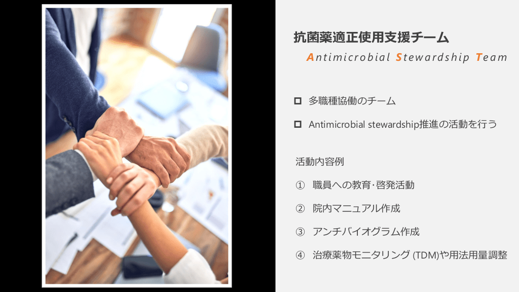 抗菌薬適正使用支援チーム Antimicrobial Stewardship Team 多職種協働のチーム Antimicrobial stewardship推進の活動を行う 活動内容例 ① 職員への教育・啓発活動 ② 院内マニュアル作成 ③ アンチバイオグラム作成 ④ 治療薬物モニタリング (TDM)や用法用量調整 #56.