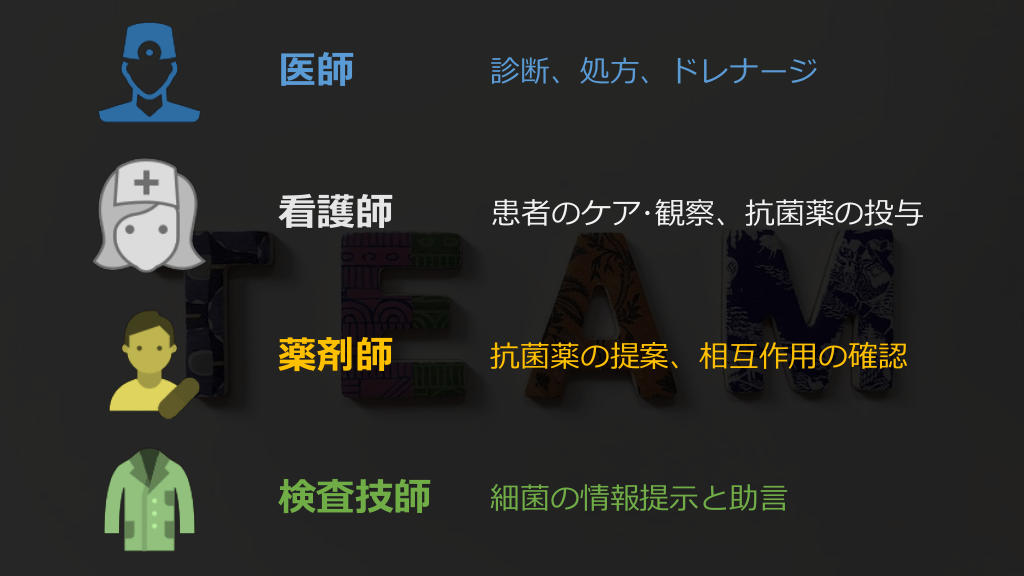医師 診断、処方、ドレナージ 看護師 患者のケア・観察、抗菌薬の投与 薬剤師 抗菌薬の提案、相互作用の確認 検査技師 細菌の情報提示と助言 #57.