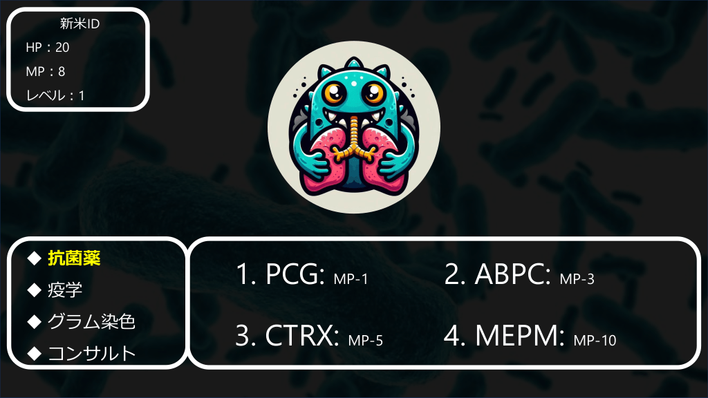 新米ID HP:20 MP:8 レベル:1 ◆ 抗菌薬 ◆ 疫学 ◆ グラム染色 ◆ コンサルト 1. PCG: MP-1 2. ABPC: MP-3 3. CTRX: MP-5 4. MEPM: MP-10 #8.